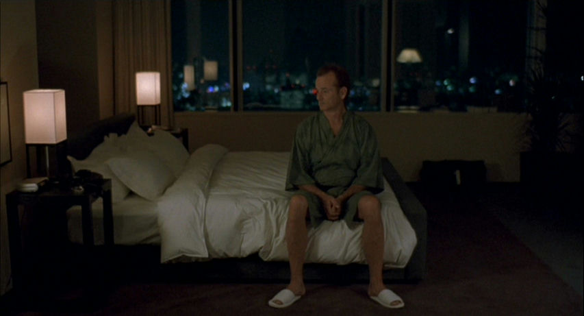 Bob Harris (Bill Murray) sits on a bed in a Tokyo hotel room in Lost in Translation.