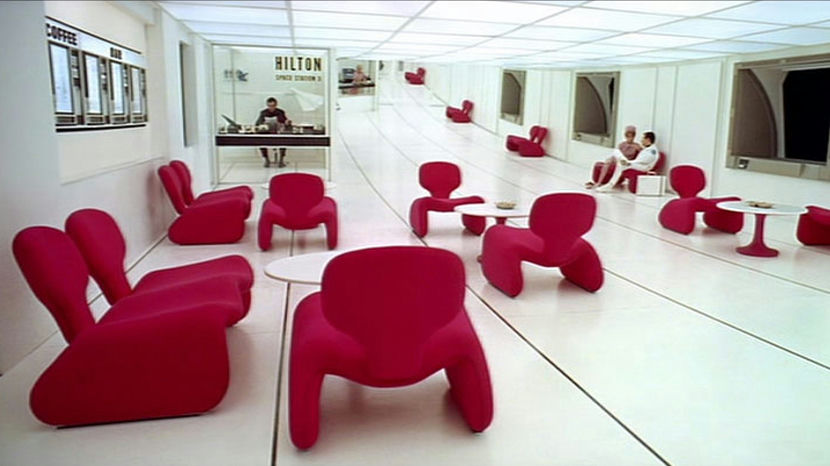 As Dr. Floyd enters the stark white Hilton lobby, our eyes are immediately drawn to the playful bright red chairs. The set is at once futuristic and relaxed; the audience can easily imagine itself living like that. The red chairs are actually the ‘Djinn’ chairs designed by Olivier Mourgue, and they became very popular after the release of the film. The pedestal tables are by Eero Saarinen.