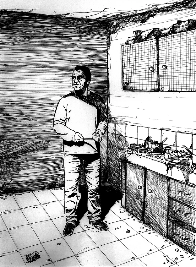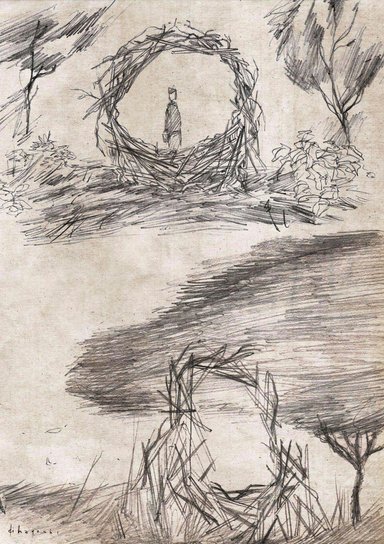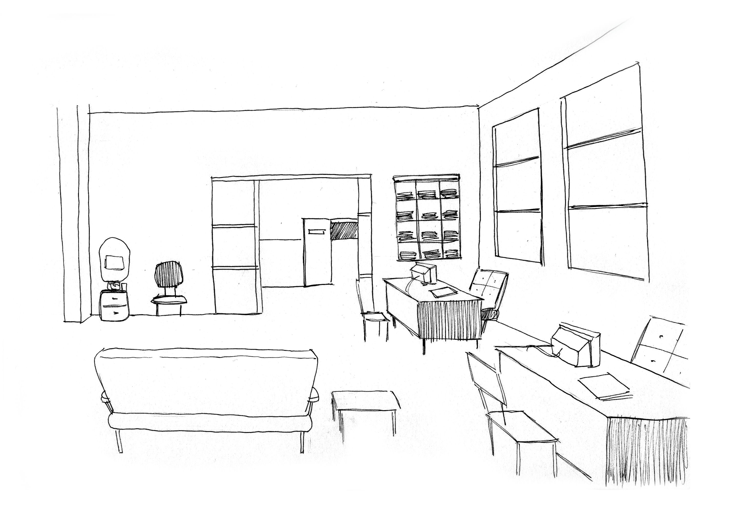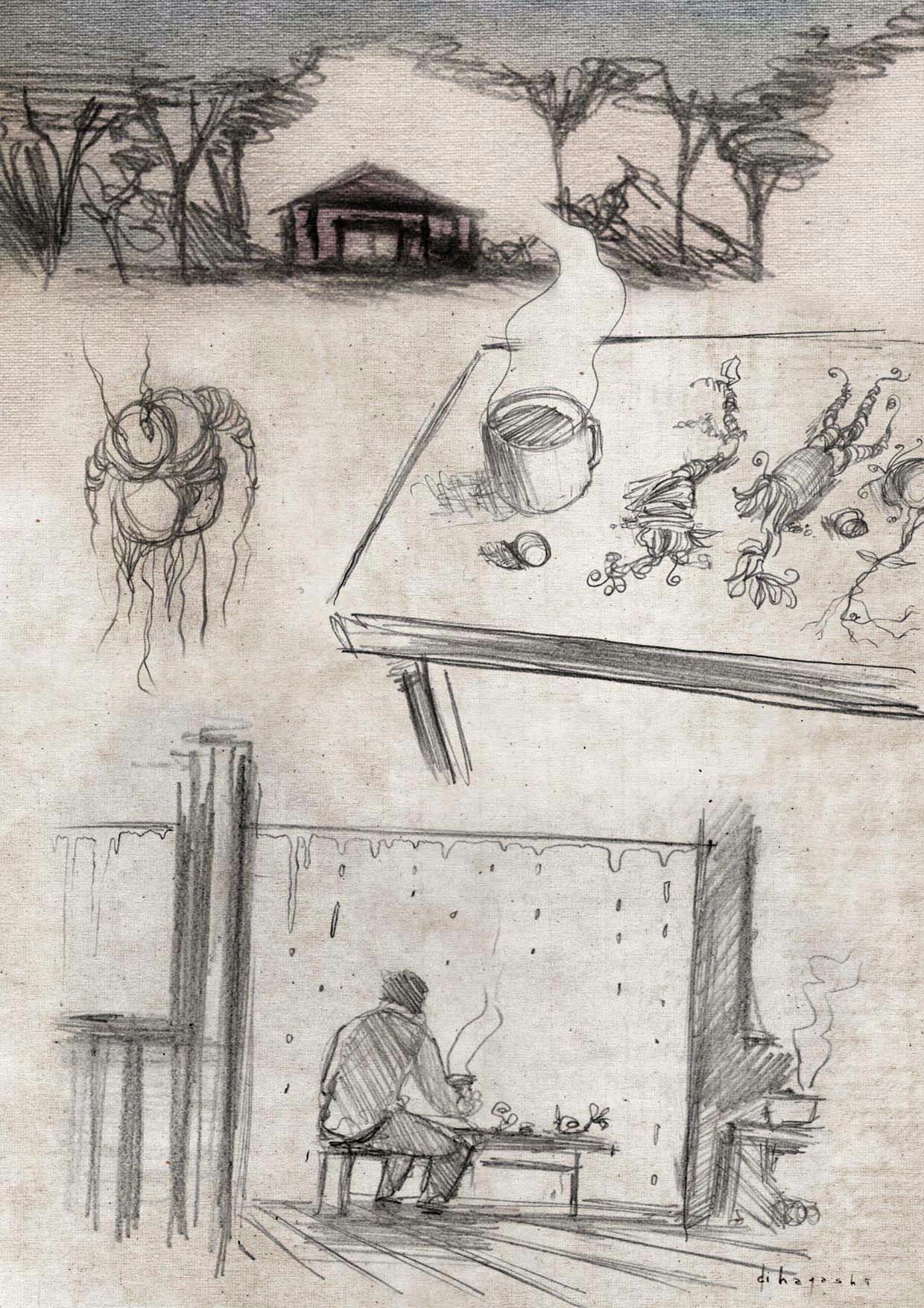 In a more traditional film production like "Elon Doesn't Believe in Death" I visit locations and sketch really quick what catches my attention, for later researching and mood boarding. I really do not spend too much time on the drawing, sometimes they are very rough notes, so it works as a way of thinking and memorizing, for me it's a good way of creating a finished concept.