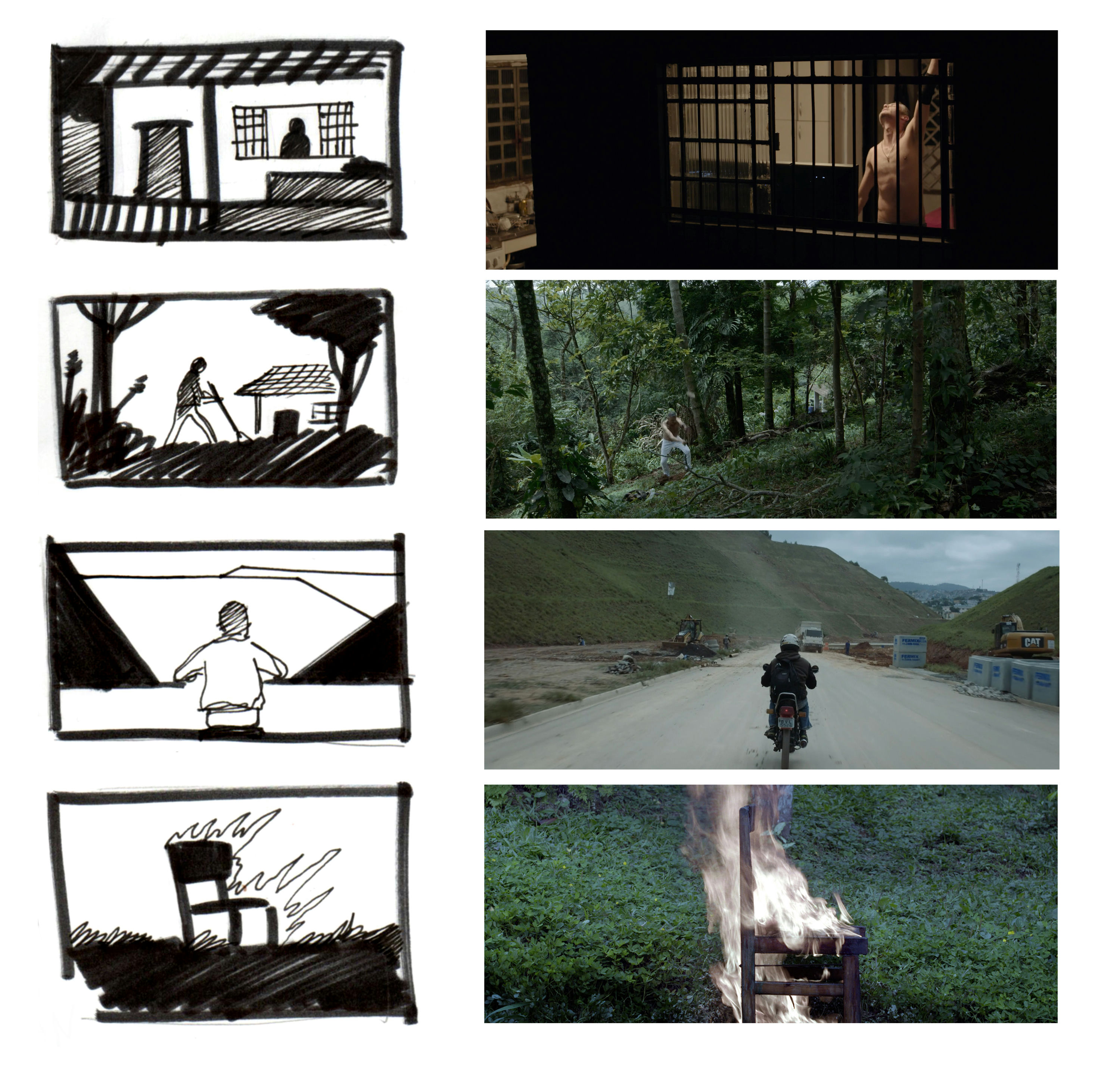 In the short film "Savage Fire" I knew exactly where, what and how I wanted to film, since it was my hometown and i knew it so well. So I did very loose drawings, enough so the crew would get the sequences ideas, but, the most important thing was to take them to the location to understand its environment. Drawing here was a narrative guide, to be changed, added or eventually cut.