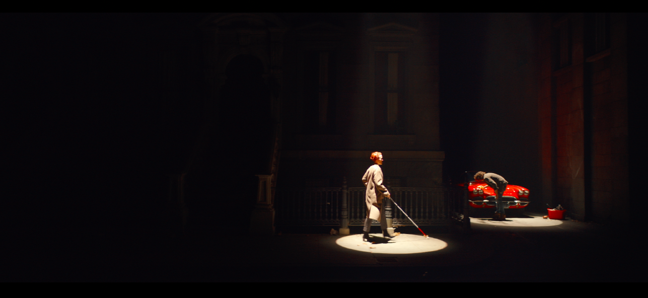 Originally scripted as vignettes built on stage, both Director Fredrik Bond and I knew we would need scale of buildings and travel distance for this to feel like an authentic neighborhood and not a theater set. These would need to be exteriors shot overnight. We scouted several backlots and landed on one with wide city streets and a variety of large buildings we could catch along her journey. Cinematographer Claudio Miranda developed a moving spotlight rig with which to follow talent.