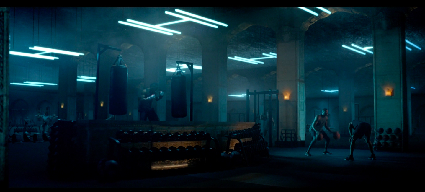 We covered the floor completely with new black rubber, brought in the high design gym equipment and plugged the windows so that our practicals and lighting design further enhanced the tone.