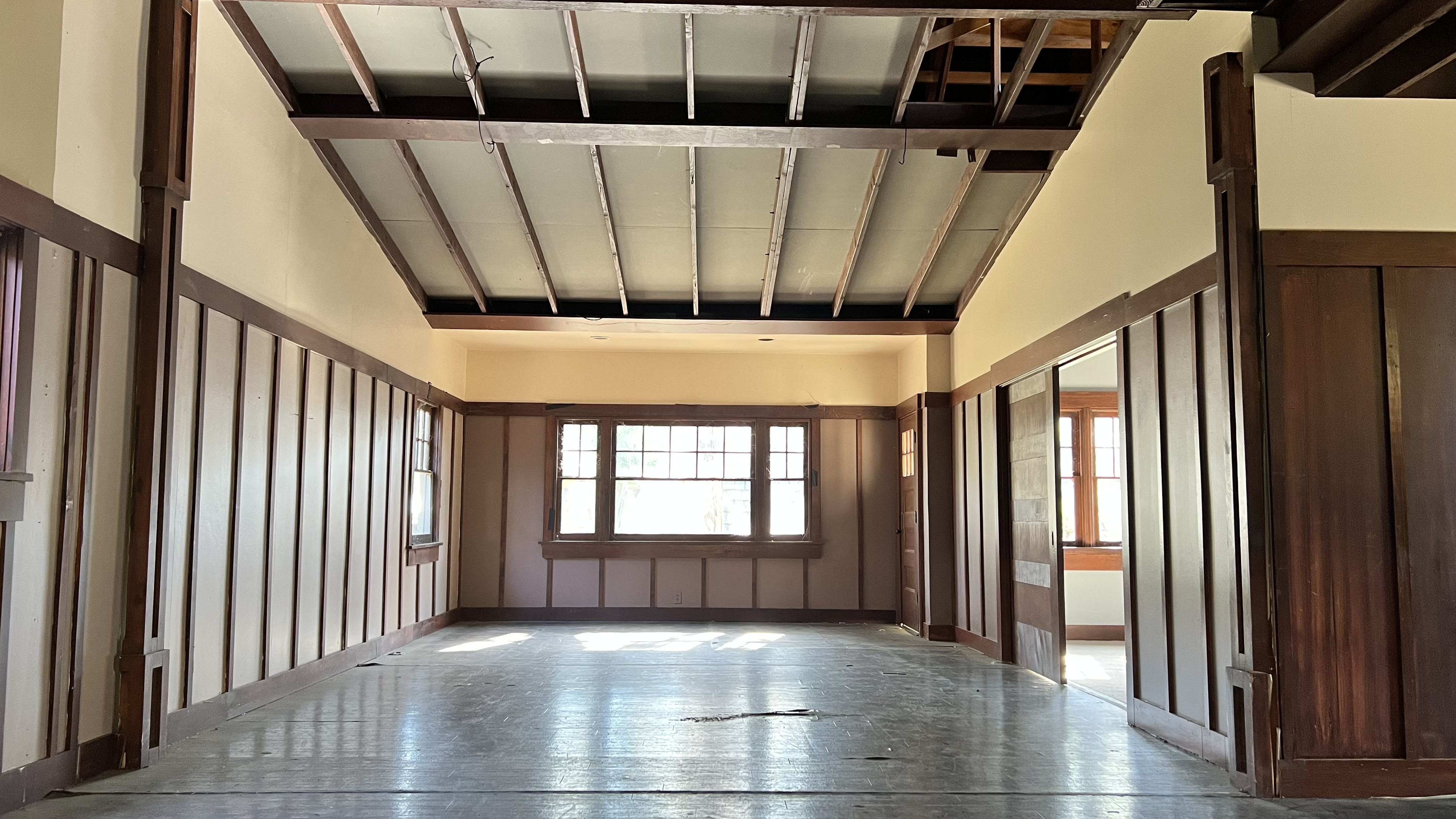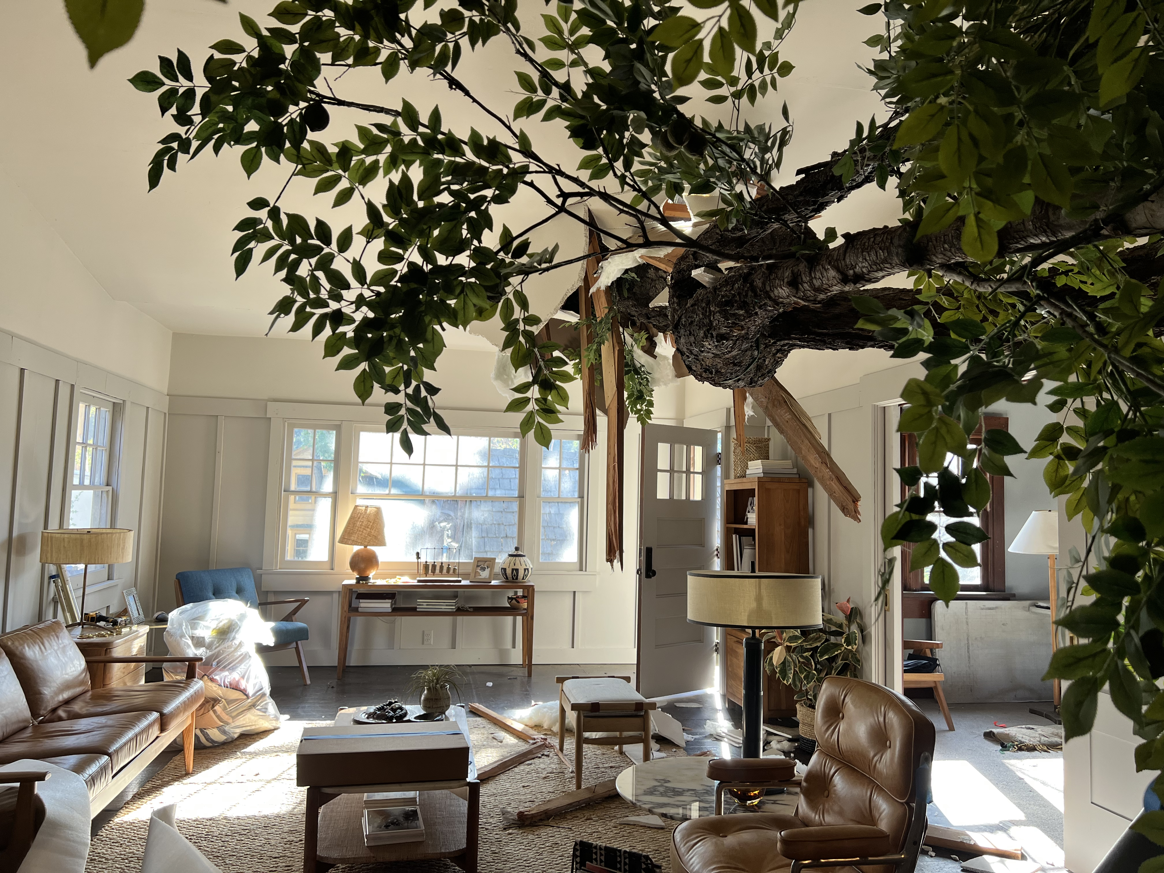 The client asked that this disaster scene be startling, but also light and comedic so having a location situated for natural light exposure helped reiterate this. We chose a Craftsman -inspired backlot house with a pitched ceiling that had a few removable lighting access panels and thankfully properly enforced girders we could rig the tree from. Construction closed in the ceiling as if always a flat design, repainted the interior completely and set decoration brought in contemporary dressing.