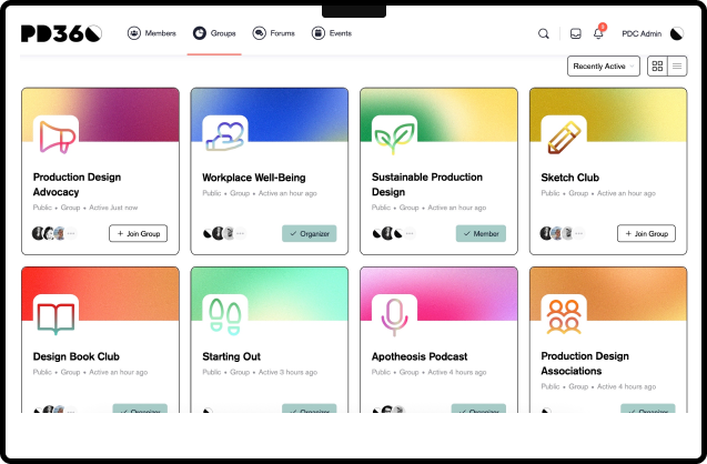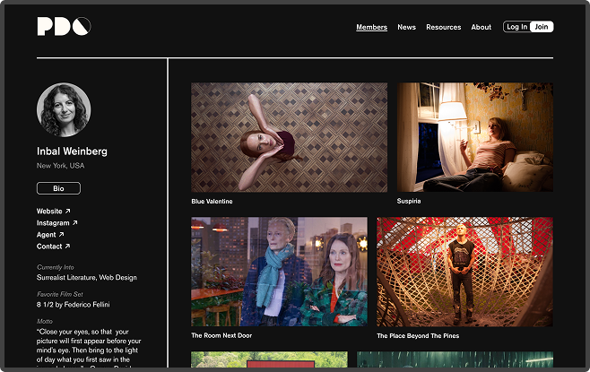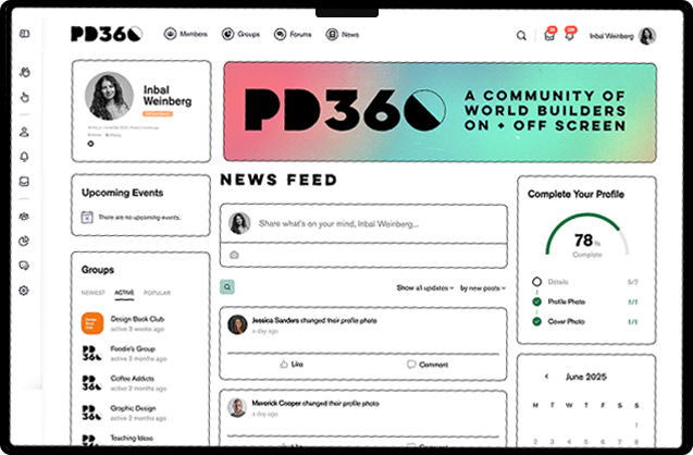 PD360 is the Production Designers Collective’s members-only platform offering exclusive access to community forums, events, mentoring, peer networking, and portfolio hosting.