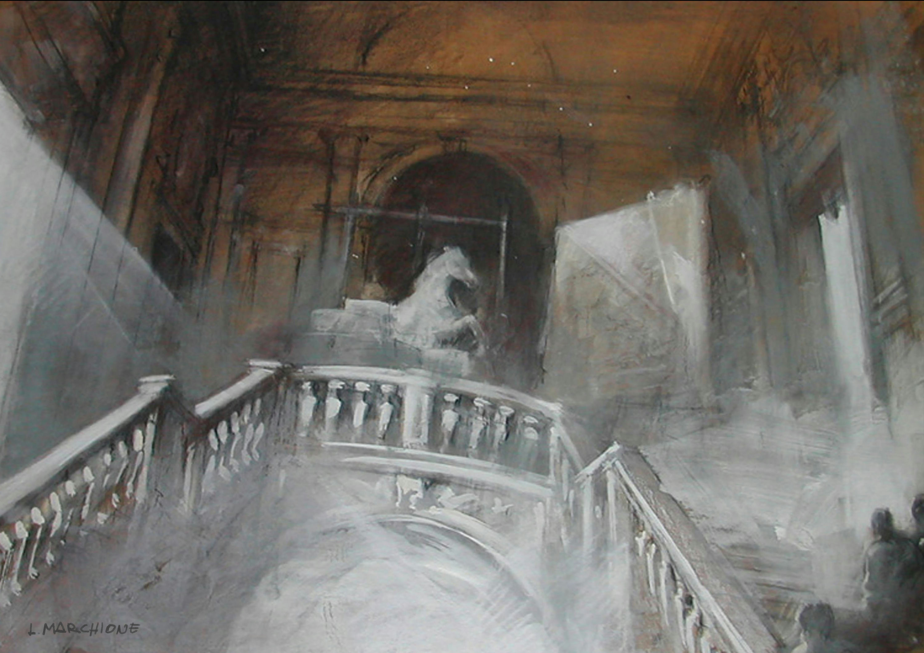 To maintain the cinematic immediacy of my sketches, I usually work by framing them in a 16: 9 frame: within each frame, the work is stratified; scene by scene; without ever erasing the errors but processing them. I avoid using the eraser and I often use the pen, the charcoal and the pastel, which force me to a sure sign, without second thought.