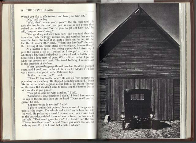 In "The Home Place" pictures appear on every other page of the novel, carefully arranged to correspond to the text opposite. Many of the photographs seem to illustrate directly the images or action occurring on the facing pages, but they always go beyond mere exposition, and are as much a part of the fabric of the novel as the text. This account in first-person narrative and photographs of the one-day visit of Clyde Muncy to "the home place" at Lone Tree, Nebraska, has been called "as near to a new fiction form as you could get."