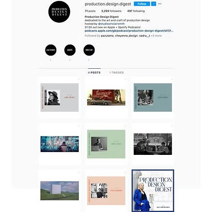 Production Design Digest highlights designs by film, with stunning images and associated quotes and descriptions. They also launched a new podcast dedicated to the art and craft of production design, featuring interviews with production designers and hosted by Kelly Sinclair Smith @studiosinclairsmith.