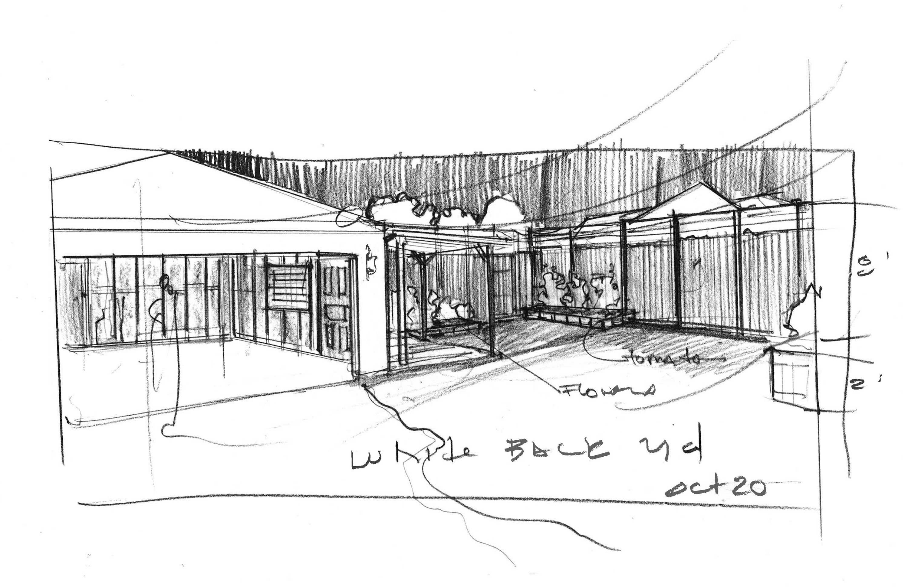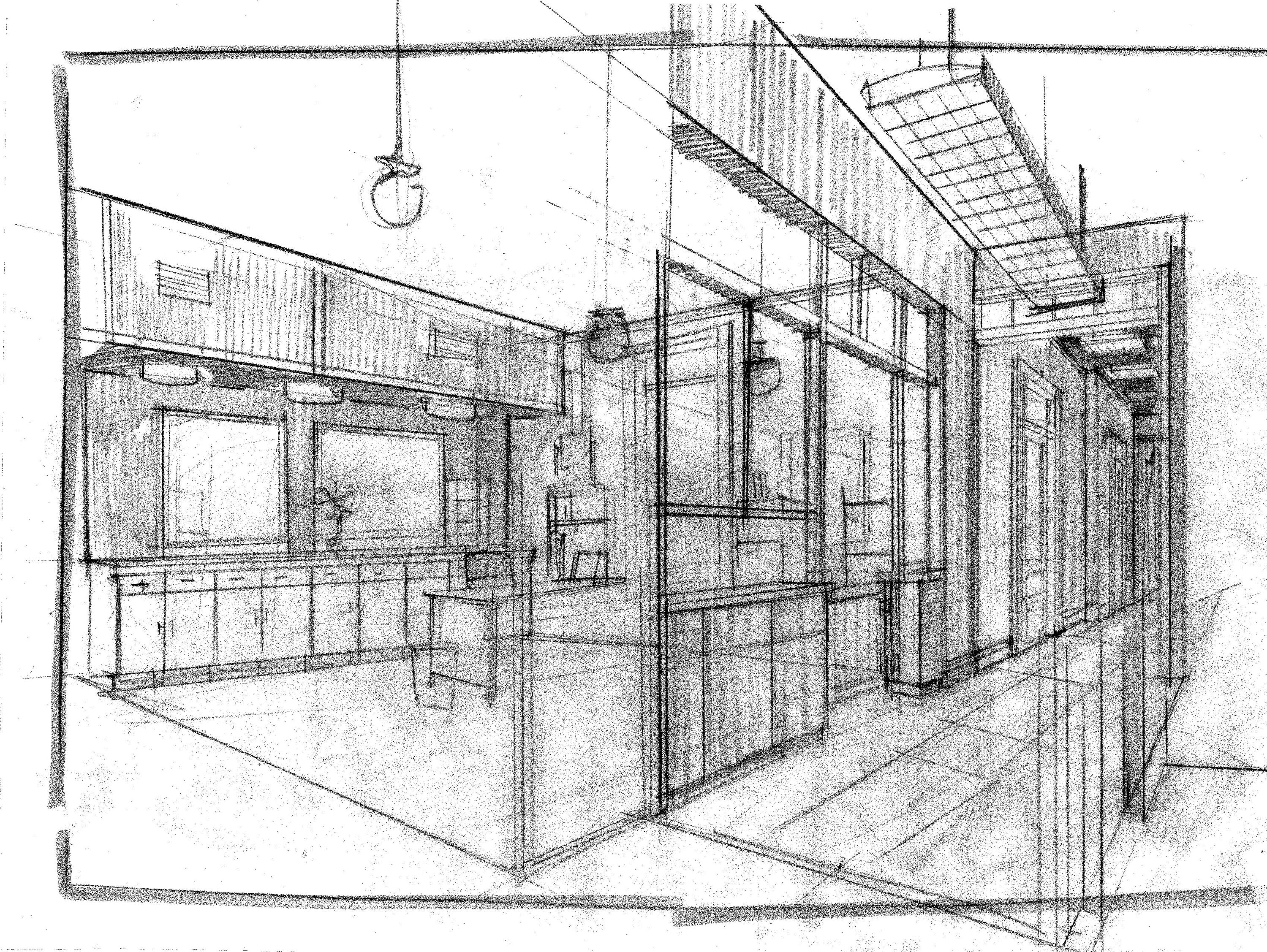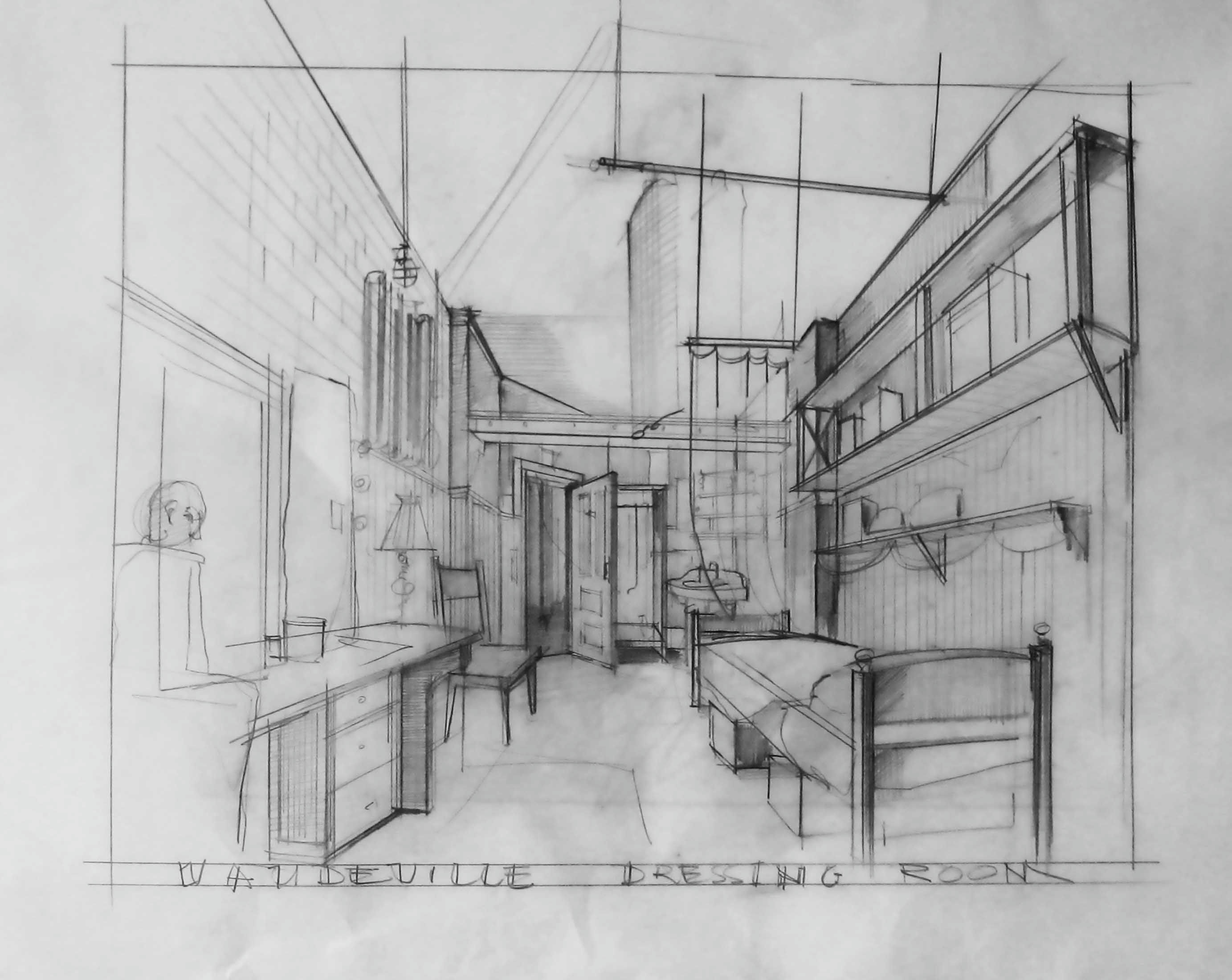Sketches are a way to explore the spaces and are not tonal camera frame oriented illustrations. They are instructional. I use the pencil because it is quick. The process helps me think. And finally the sketches are suggestive for the making group by providing a basic look. And for the director they are points of discussion.