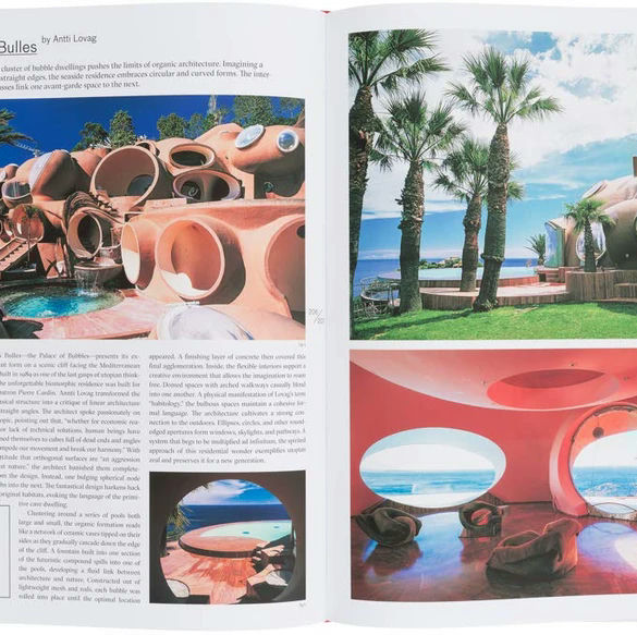 The book highlights well-known projects such as Eero Saarinen's TWA terminal and Oscar Niemeyer's Communist Party headquarters in Paris, as well as avant-garde and offbeat structures such as Paolo Soleri's Arcosanti.